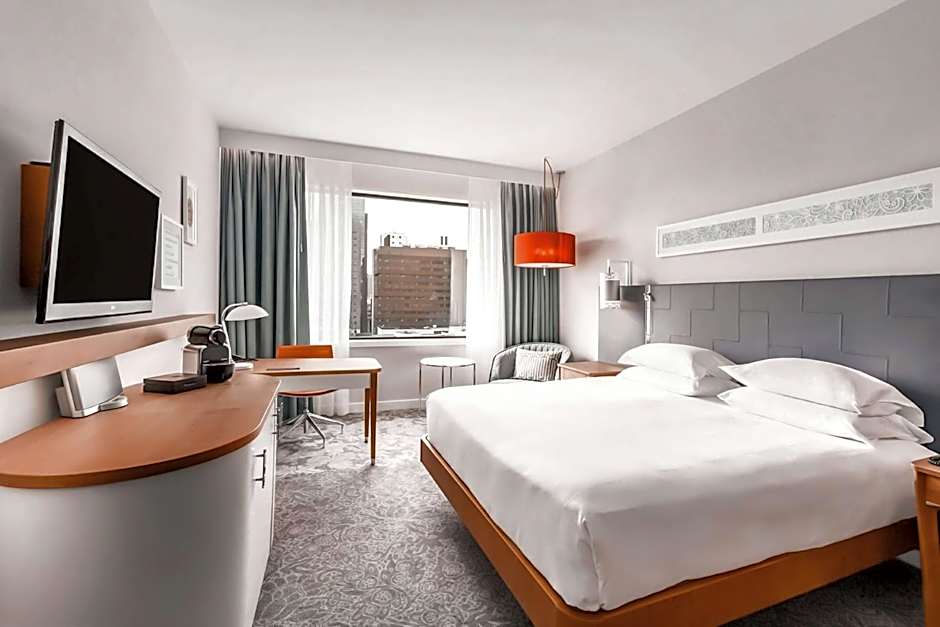 Admire the city view from the 9th and 10th floors of the hotel in this King Hilton Executive Room. The room features one king-sized Hilton Serenity bed, plus a spacious bathroom with bath or walk-in shower. Additional amenities include 2 complimentary bottles of water and a Nespresso coffee machine. Enjoy exclusive access to the Executive Lounge, serving coffee, tea and fresh fruits. Breakfast, a drink and appetizer will be served at JAQ restaurant. Stay connected with complimentary WiFi access and watch the LCD TV. Special touches include fluffy bathrobes, slippers and tea/coffee making facilities.